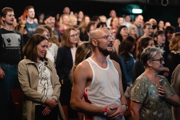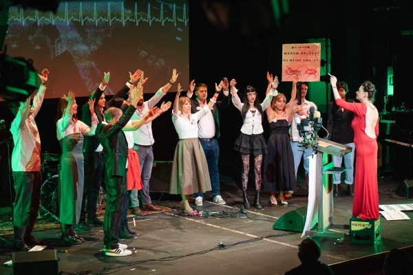 Ausgangspunkt ist der Sprechchor Pumpajmo glasno (Lass uns laut pumpen), den Ensemblemitglied Tina Keserović mit Mitgliedern der serbischen Diaspora aus Wien und Linz entwickelt hat: Stimmen, die den Rhythmus der Proteste aufnehmen, Stimmen, die Wut, Hoffnung und Beharrlichkeit tragen. Die Künstlerin Zoe Gudović wirft in einem Live-Essay ihren ganz persönlichen Blick auf die politischen Verwerfungen der Region. Dazu bringt die Band Deca iz Vode – EKV-Tribute-Band und Begleiterin der Proteste – ihren Sound und ihre Erzählungen von den Straßen Belgrads auf die Bühne. Der Kurzfilm Tačka pucanja (Bruchpunkt) von Lazar Jovanović, die Aktivist:innen von Blokada Beč, unterschiedliche Stimmen aus Serbien und die Wiener Punkband Ausländer eröffnen weitere Perspektiven auf Widerstand und Solidarität. Zum Abschluss: eine Stunde Tanz zu den Sounds der Queer Yugo Pop Party. Die Bühne wird zum Auftakt der neuen Saison mit allen eingetanzt. Im SchauspielhausWien Beč wird Diskurs zu Disko und Bewegung zu Protest. Die Veranstaltung wird moderiert von Ivana Urban.